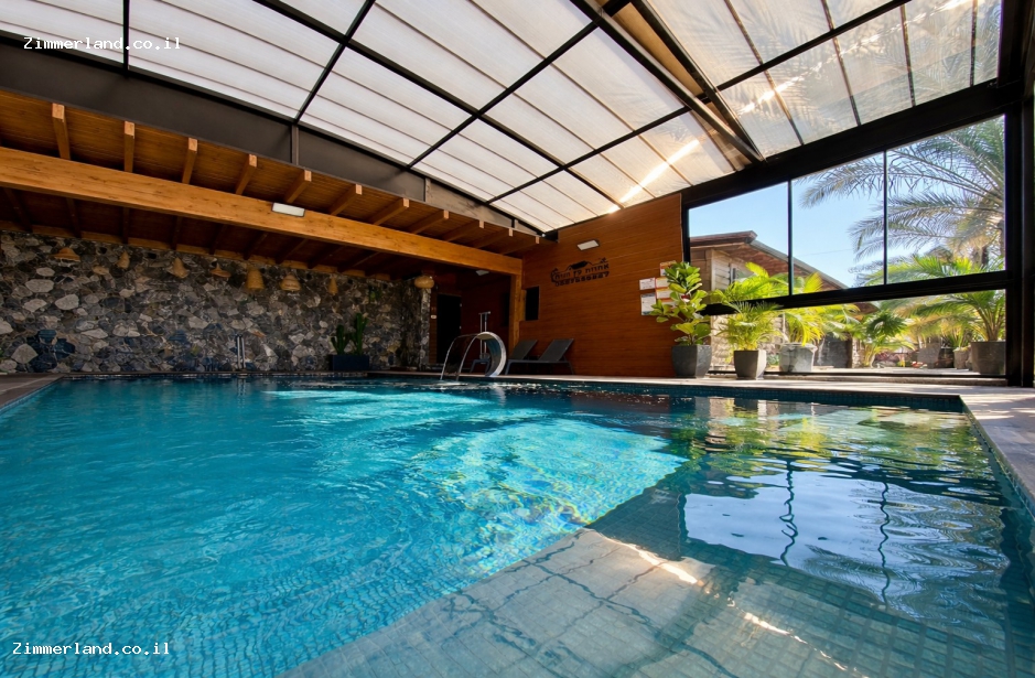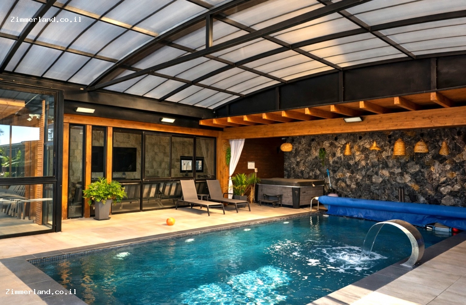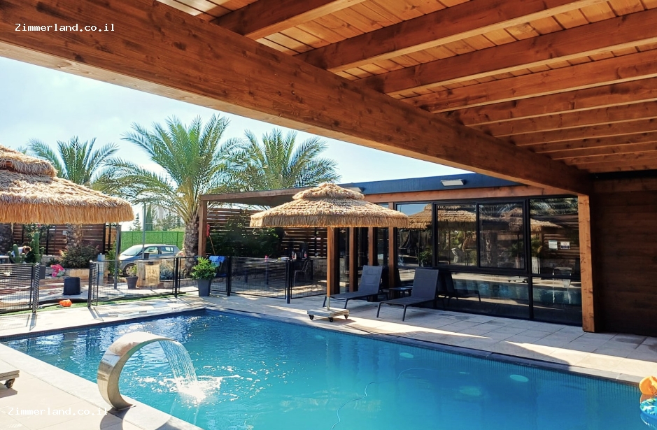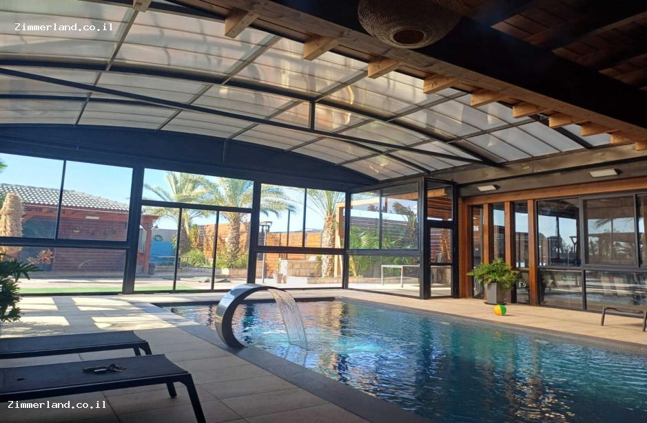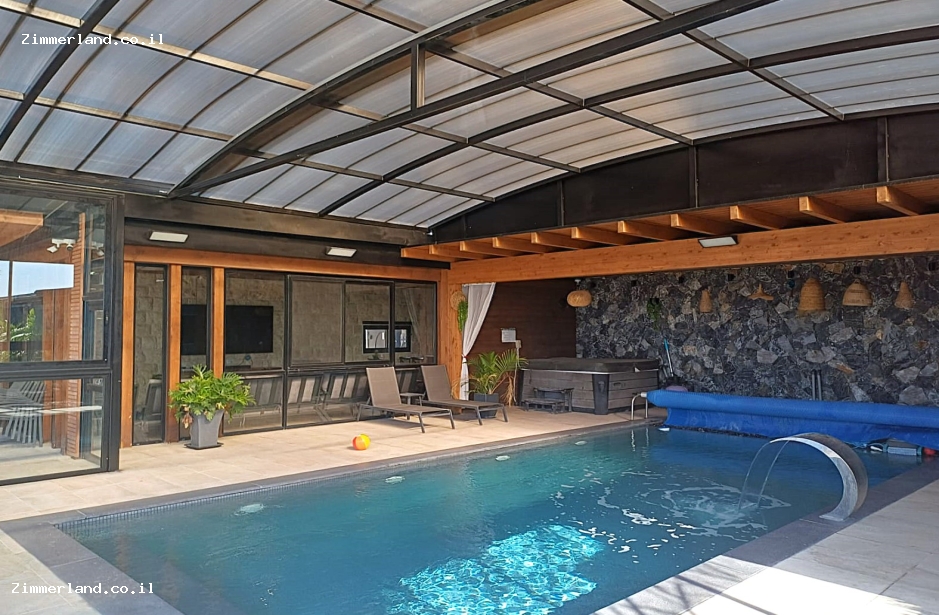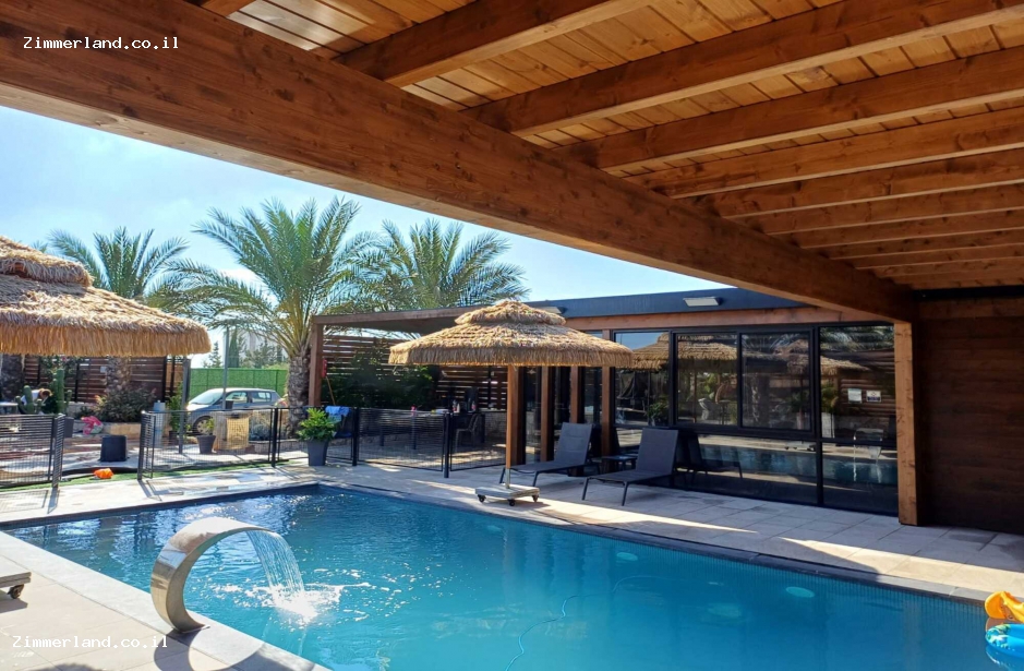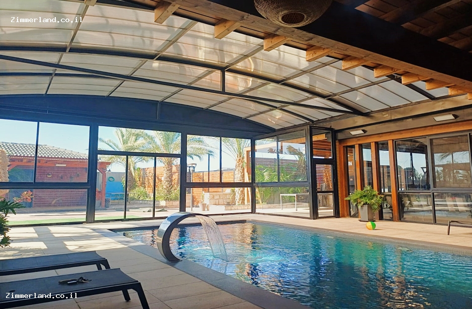 לצימרים יש חצר גדולה ומשותפת, עם בריכת שחייה גדולה – מגודרת, מחוממת ומקורה בחורף.