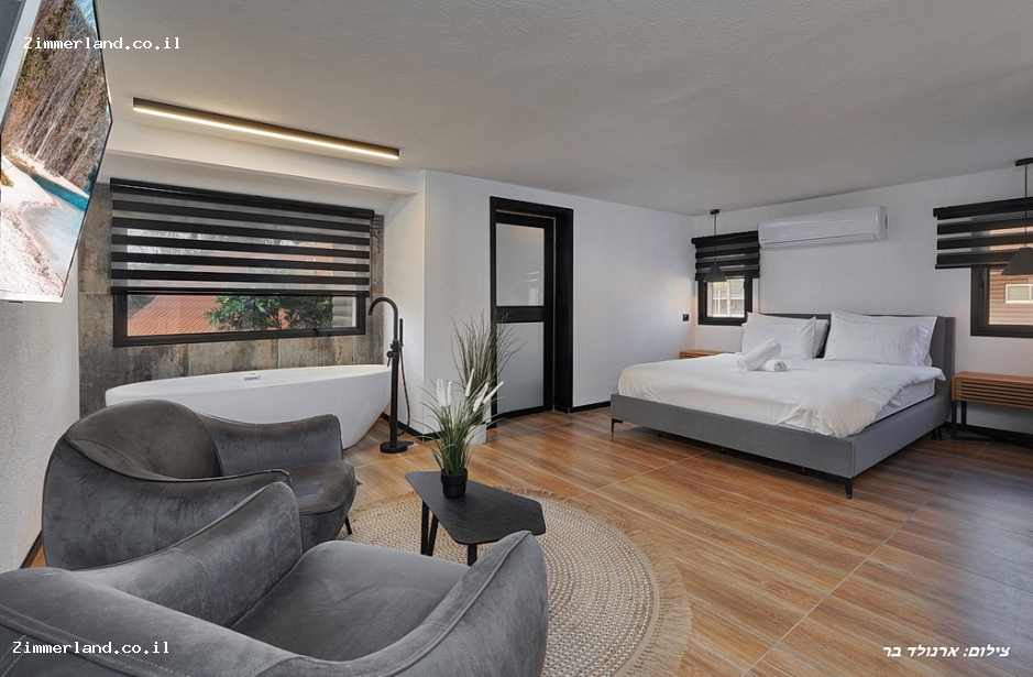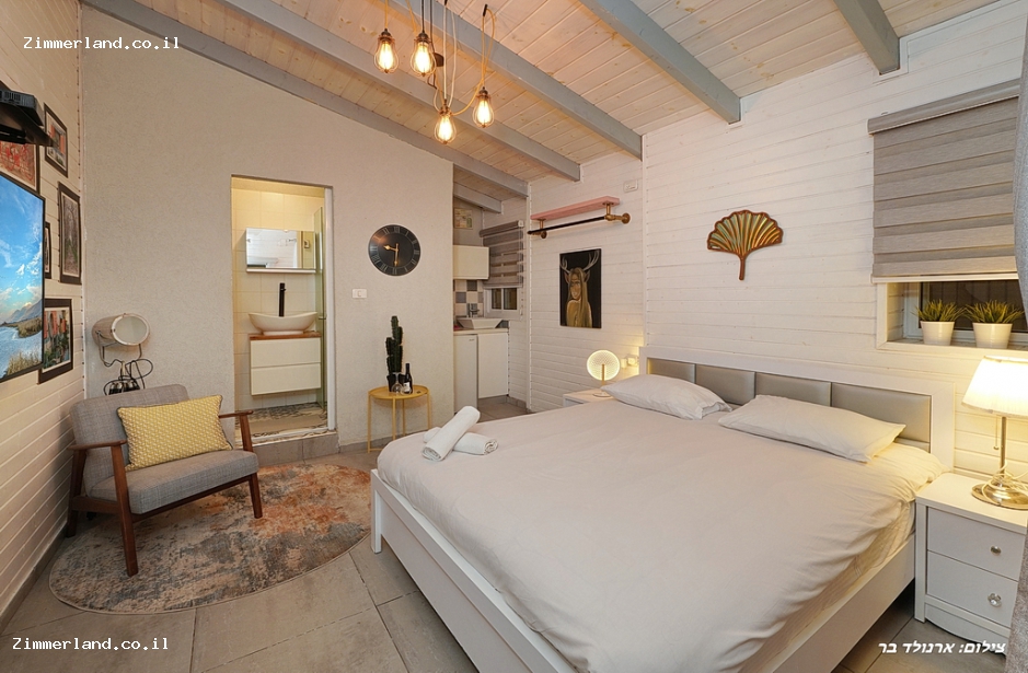 בסוויטה 1 - יש מיטה זוגית בחלל מרכזי + חדר שינה נוסף עם מיטה זוגית וספה נפתחת למיטה זוגית. בנוסף אמבטיה צפה, טלוויזיה, מזגן, מקלחת ושירותים- הסוויטה מתאימה לזוג + 4.