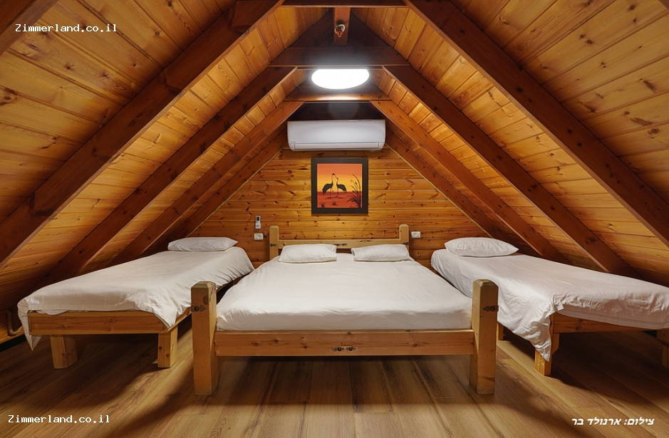3 בקתות עץ המתאימות ל 8 אורחים - יש מיטה זוגית בחלל המרכזי וגלריה עם 2 מיטות זוגיות ו 2 מיטות יחיד.