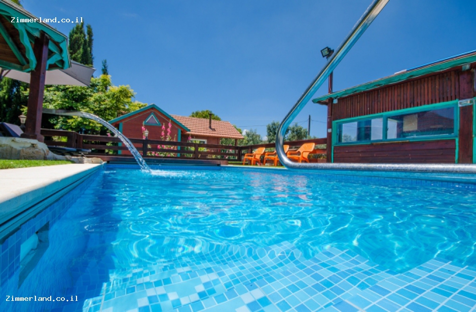 בחצר המדהימה של בקתה בכפר, ממתינה לכם בריכת שחייה בנויה גדולה במיוחד (מחוממת בחורף), ג'קוזי ספא מקורה, חדר אוכל, מדשאות, צמחייה ירוקה מטופחת, מיטות שיזוף, ערסלים ונדנדות, פינות ישיבה מוצלות, ברביקיו, תאורת גן קסומה, שולחן סנוקר ושולחן פינג פונג.