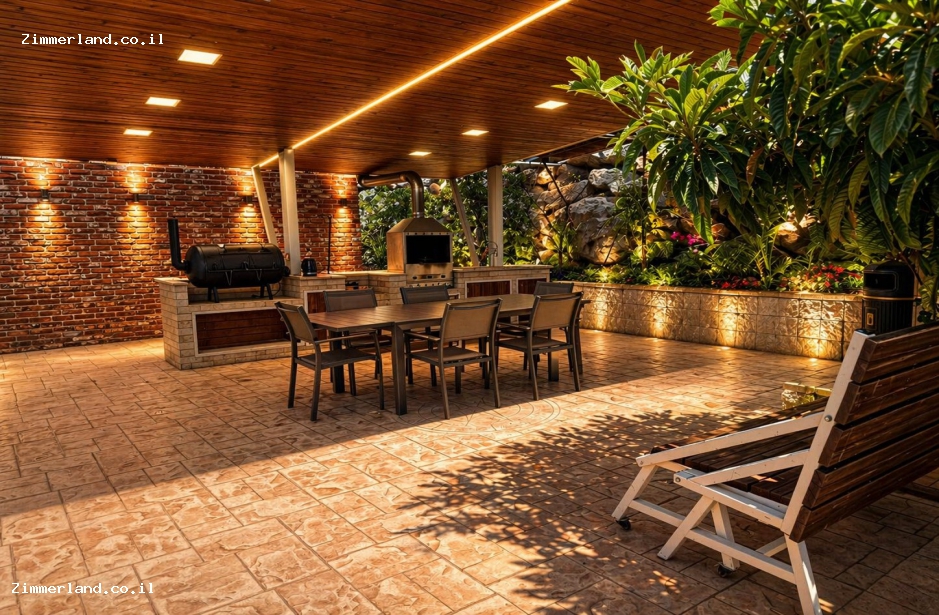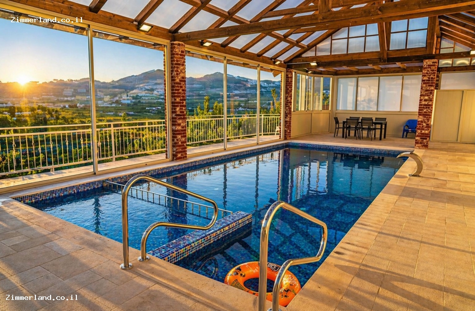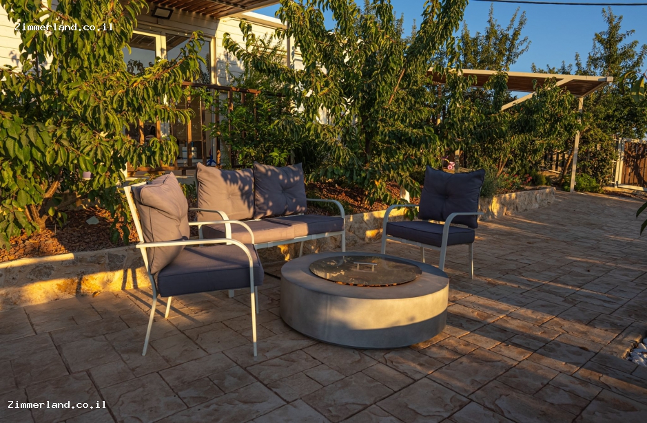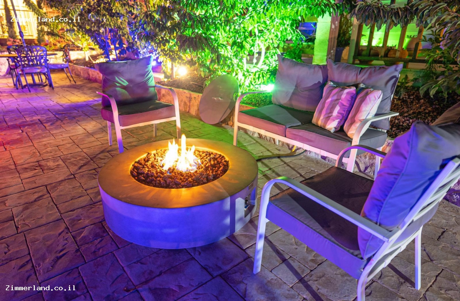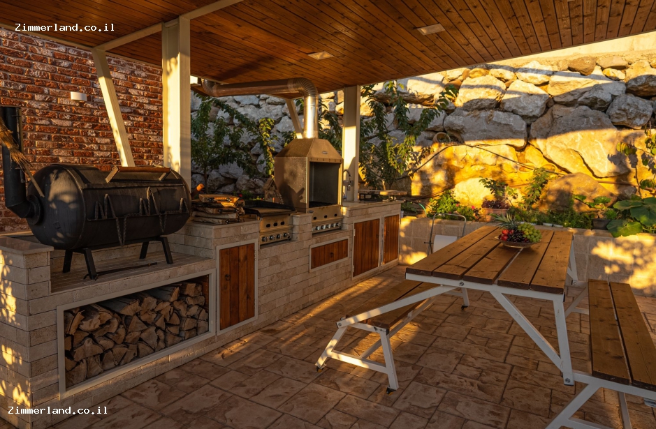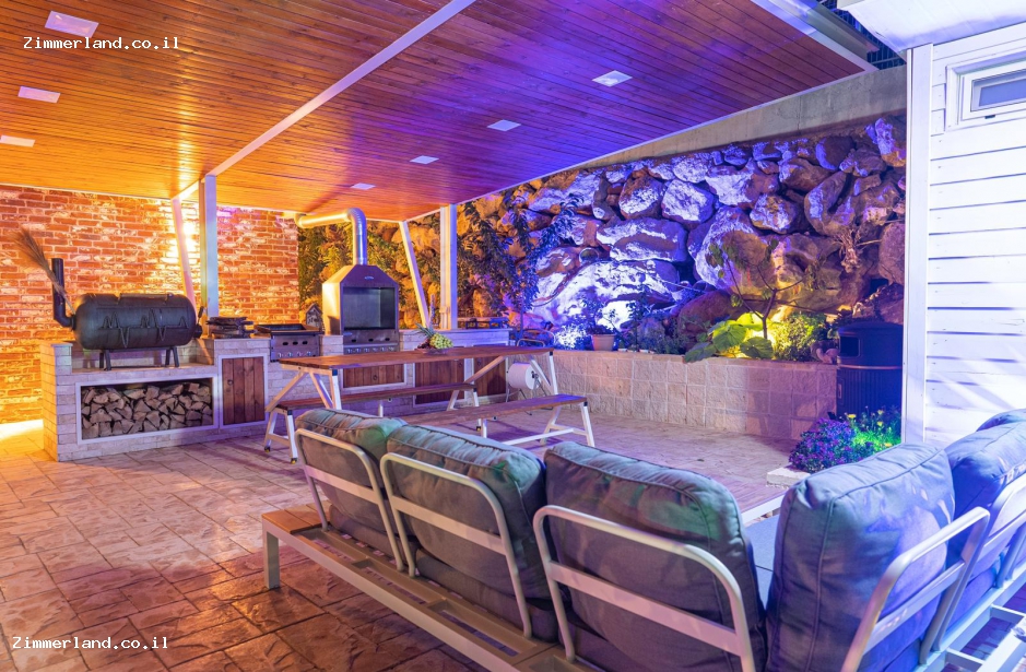 למתחם חצר גדולה ומטופחת עם מטבח חוץ מושקע במיוחד, פינת מנגל מסודרת, בריכה מחוממת ומקורה בחורף, פינות ישיבה מוצלות ותאורת גן קסומה לשעות הערב.