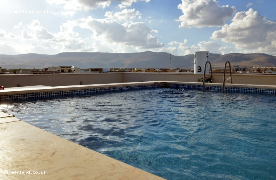 חצר או במרפסת נוף גדולה הפונה לנוף מרהיב עם בריכת שחייה פרטית – מגודרת ומחוממת בחורף.