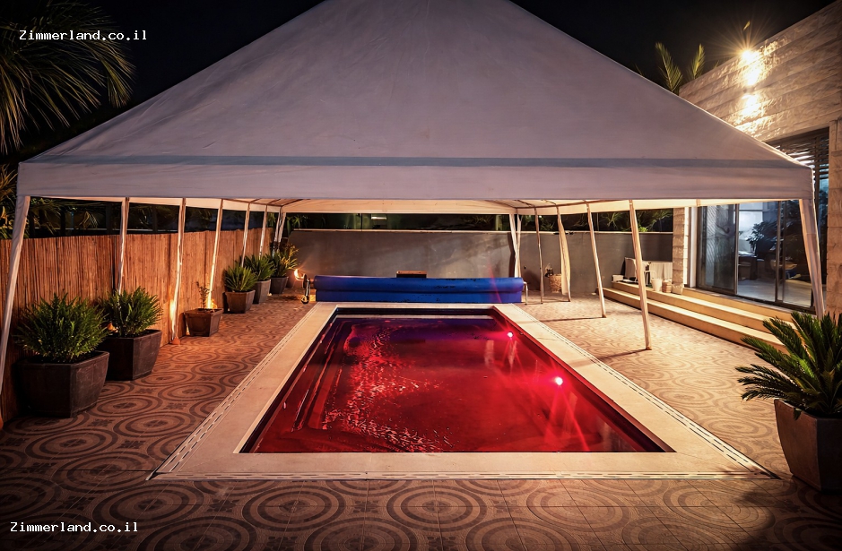 בחצר המתחם תיהנו מג'קוזי ספא גדול ל 8 אנשים, בריכת שחייה בנויה – מחוממת ומקורה בחורף, מטבח משותף גדול עם מקרר, כיריים גז, מיקרוגל ועוד, פינת ברביקיו מסודרת ואזור ישיבה משותף מקורה.