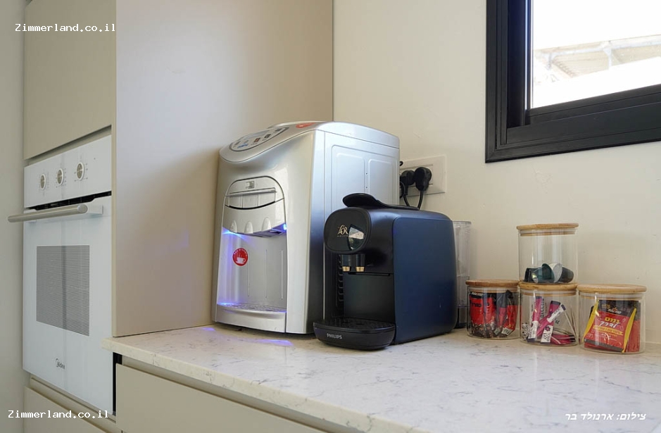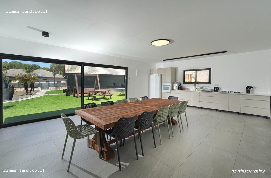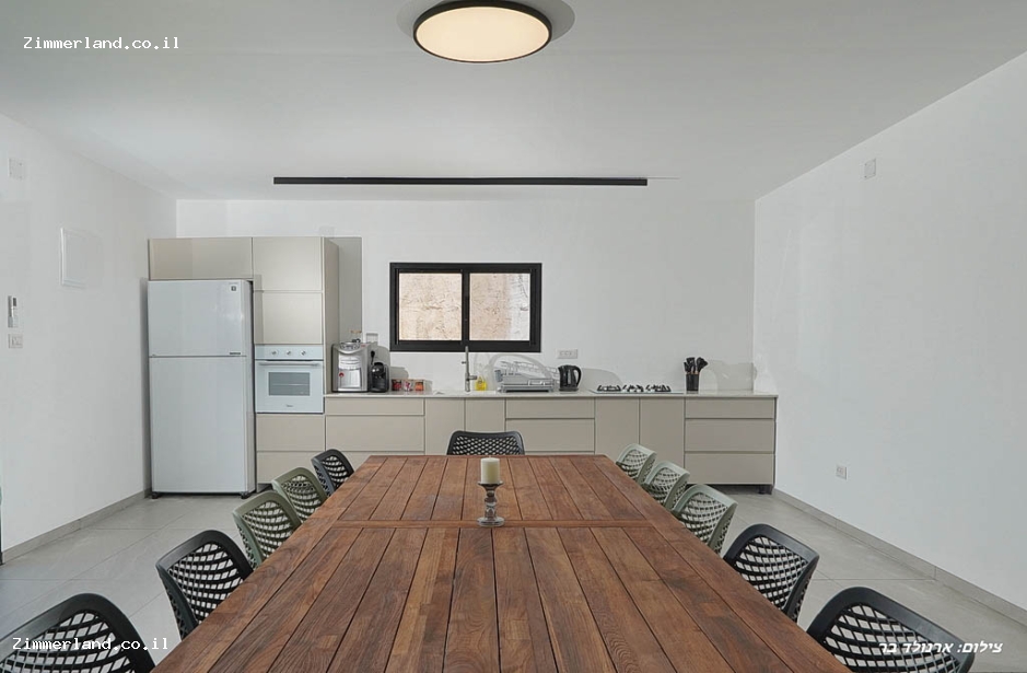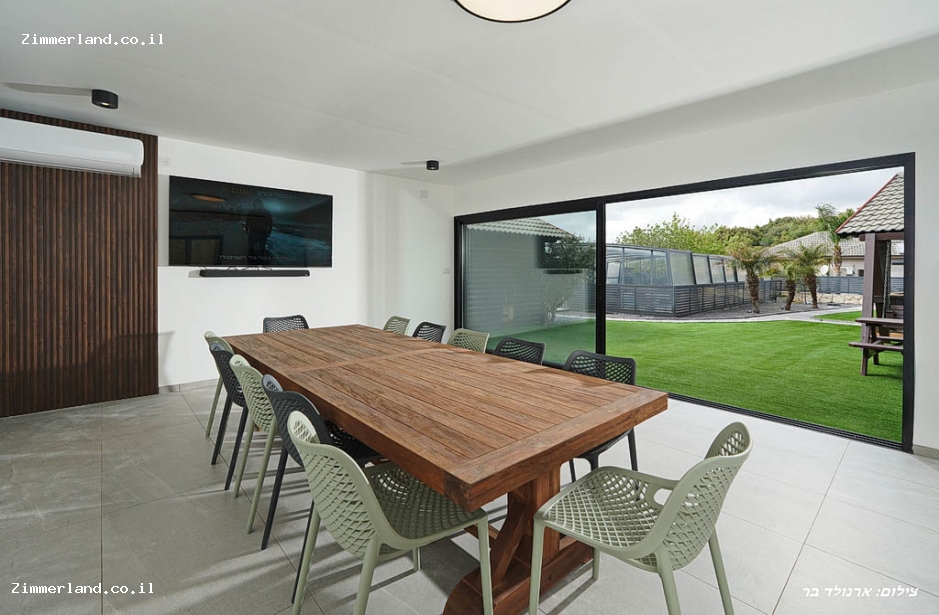 חדר אוכל לאונג' משותף, מקורה וממוזג - עם פינת אוכל ענקית ל 14 סועדים, מטבח ענק, תנור אפייה, מקרר, כיריים גז, מכונת אספרסו וקומקום חשמלי, טלוויזיה ומערכת קולנוע.