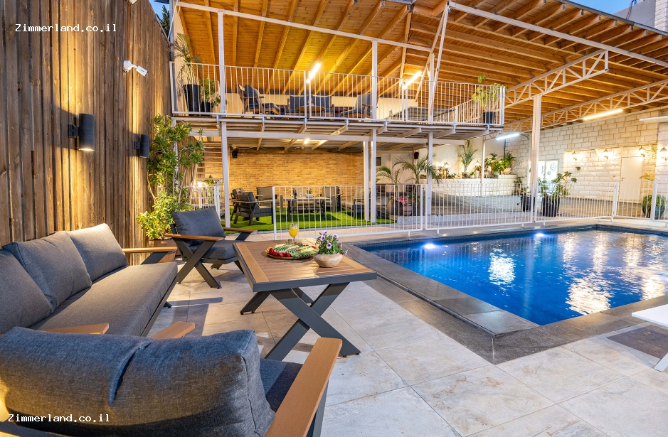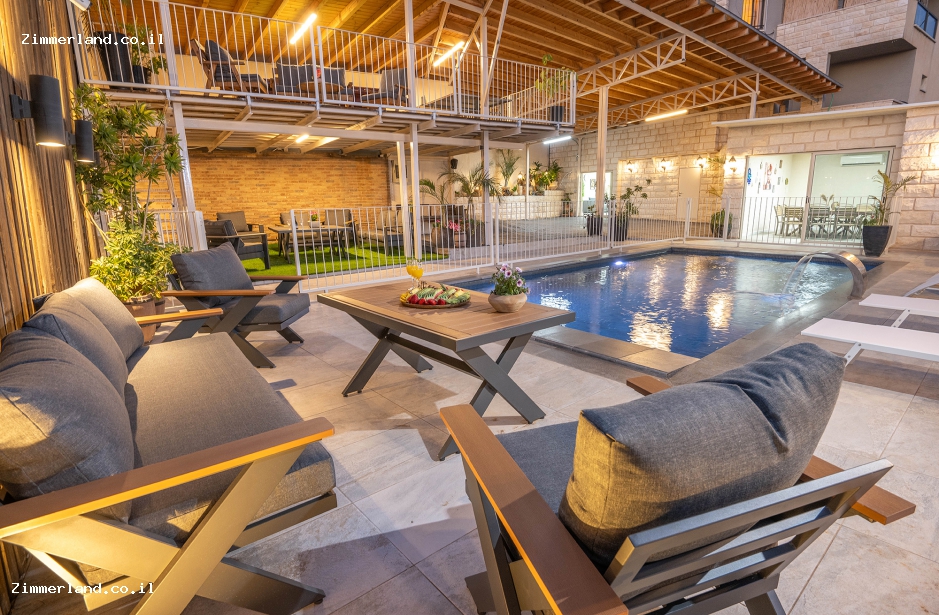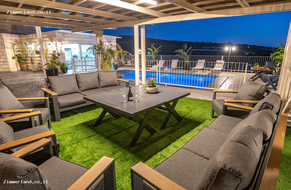 בחצר המתחם ישנה בריכת שחייה מגודרת ויפיפייה הממוקמת על קו הנוף, לצידה ריהוט גן ופינות ישיבה, פינת ברביקיו, שולחן סנוקר, שולחן פינג פונג ותאורת גן קסומה בשעות הערב.