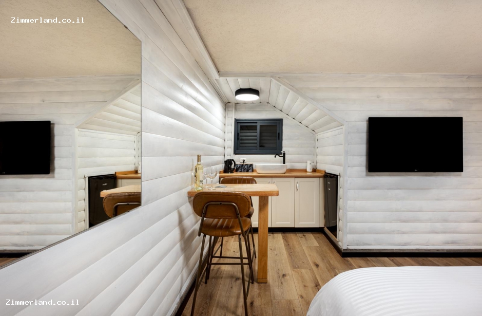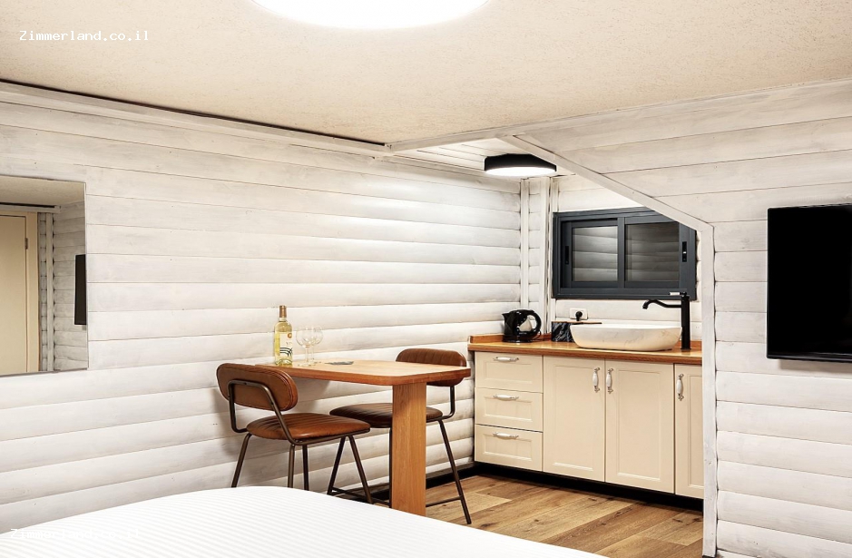 חלל סטודיו רומנטי עם מיטה זוגית מרווחת, מטבחון מאובזר הכולל מקרר מיני בר, מיקרוגל, כלי הגשה ופינת קפה חופשית, פינת אוכל זוגית, טלוויזיה בכבלים ומיזוג אוויר, חדר רחצה מפנק, מגבות גוף וסבונים.