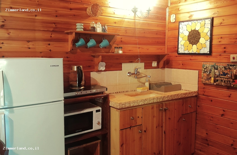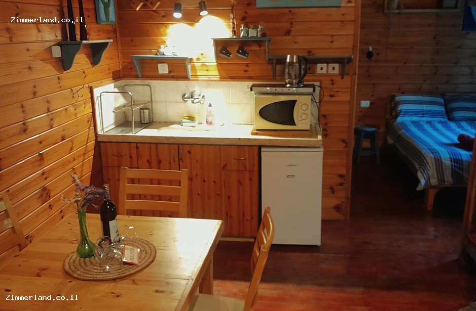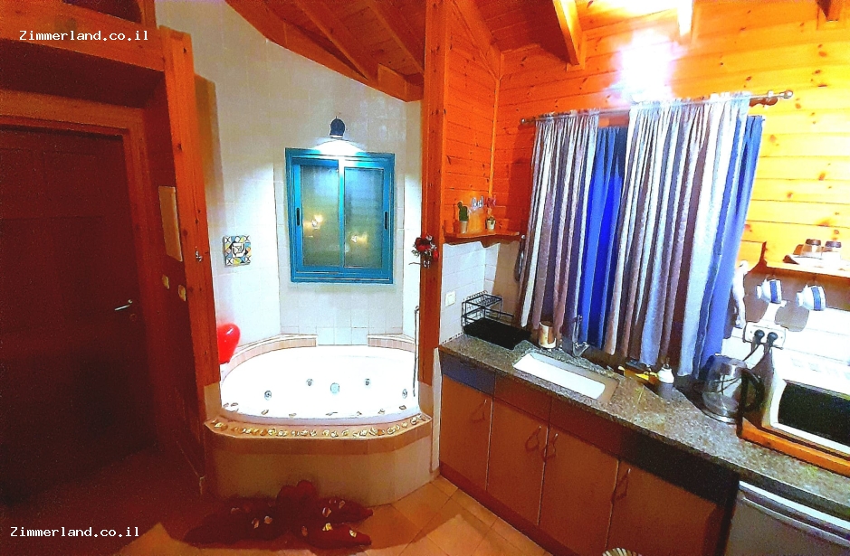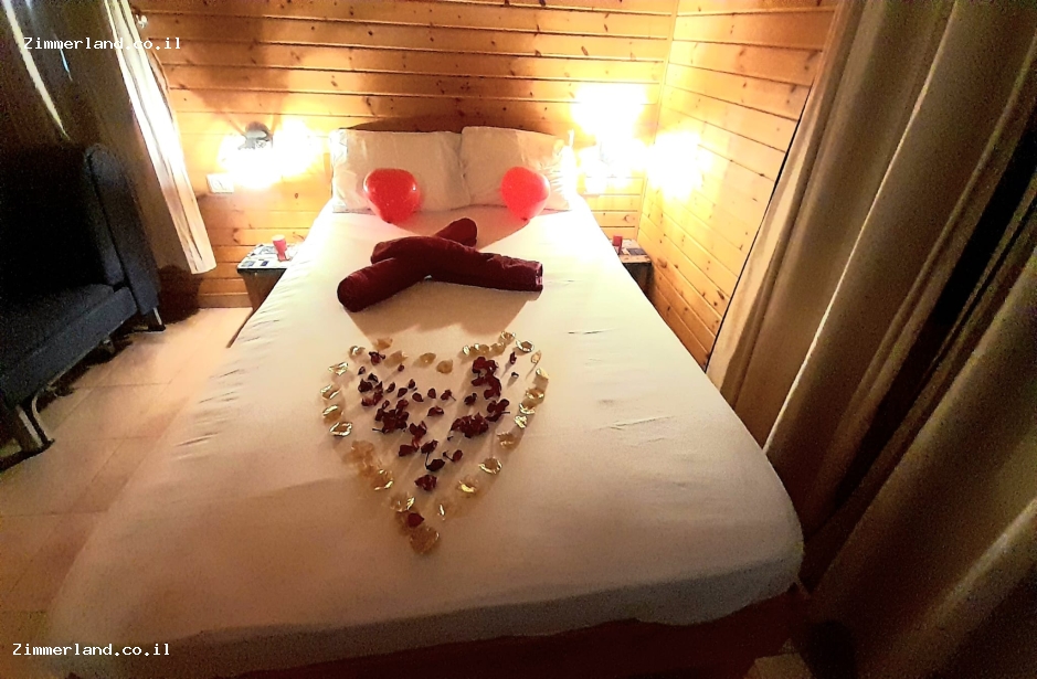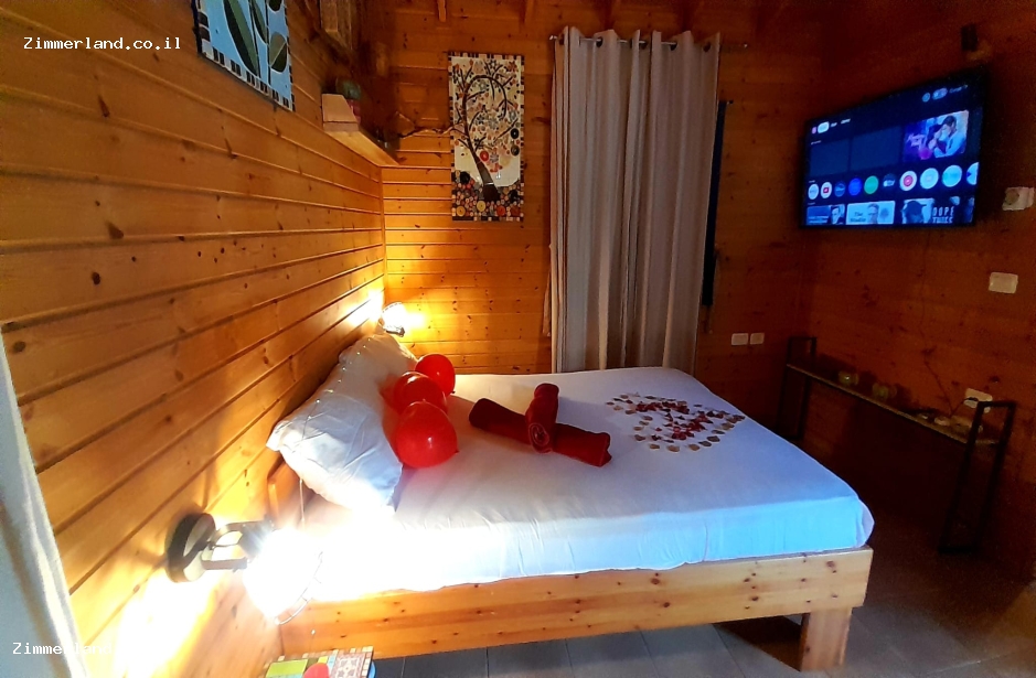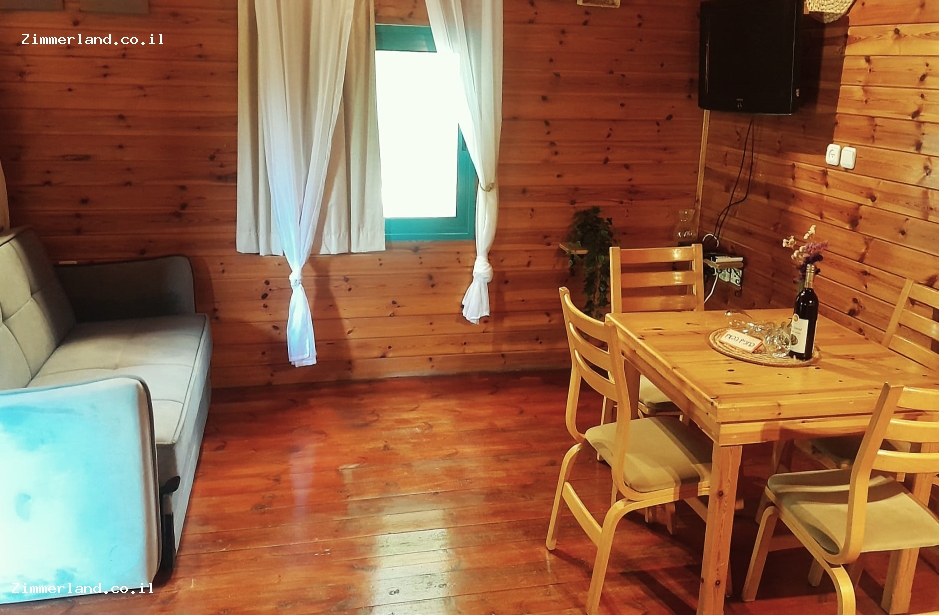 בקתה 2 –צימר עם ג'קוזי ספא פרטי, מתאים ל 4 אורחים. יש מיטה זוגית מרווחת עם מצעים מפנקים וספה נפתחת, מטבחון מאובזר, סלון עם מסך טלוויזיה בכבלים וחדר רחצה.