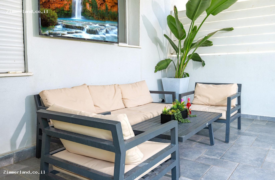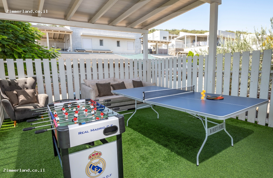 לווילה יש חצר ענקית עם בריכת שחייה גדולה מגודרת, מחוממת ומקורה בחורף, ג'קוזי ספא זרמים, מיטות שיזוף, טלוויזיה חיצונית, מטבח חוץ מקורה, משטח עבודה ועמדת מנגל, טאבון, מכונת קרח, מקרר, שולחן בר וכיסאות גבוהים, ריהוט גן יוקרתי ומפנק, שולחן פינג פונג, שולחן כדורגל ותאורת גן לשעות הערב.