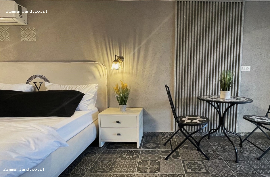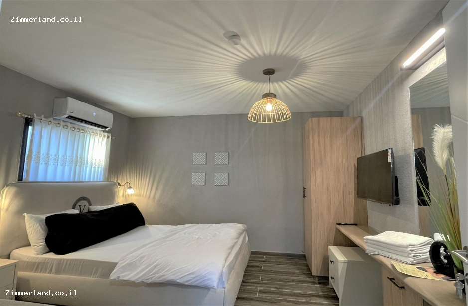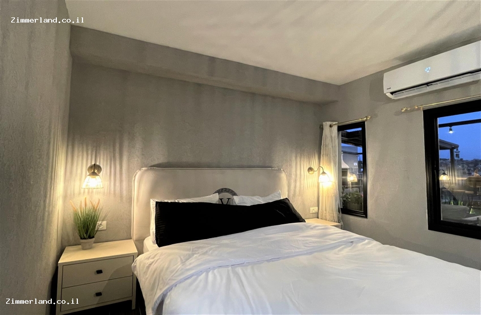 סוויטת ירח כוללת חדר שינה נפרד עם מיטה זוגית רחבה וחלל נוסף עם ספה הנפתחת למיטה.